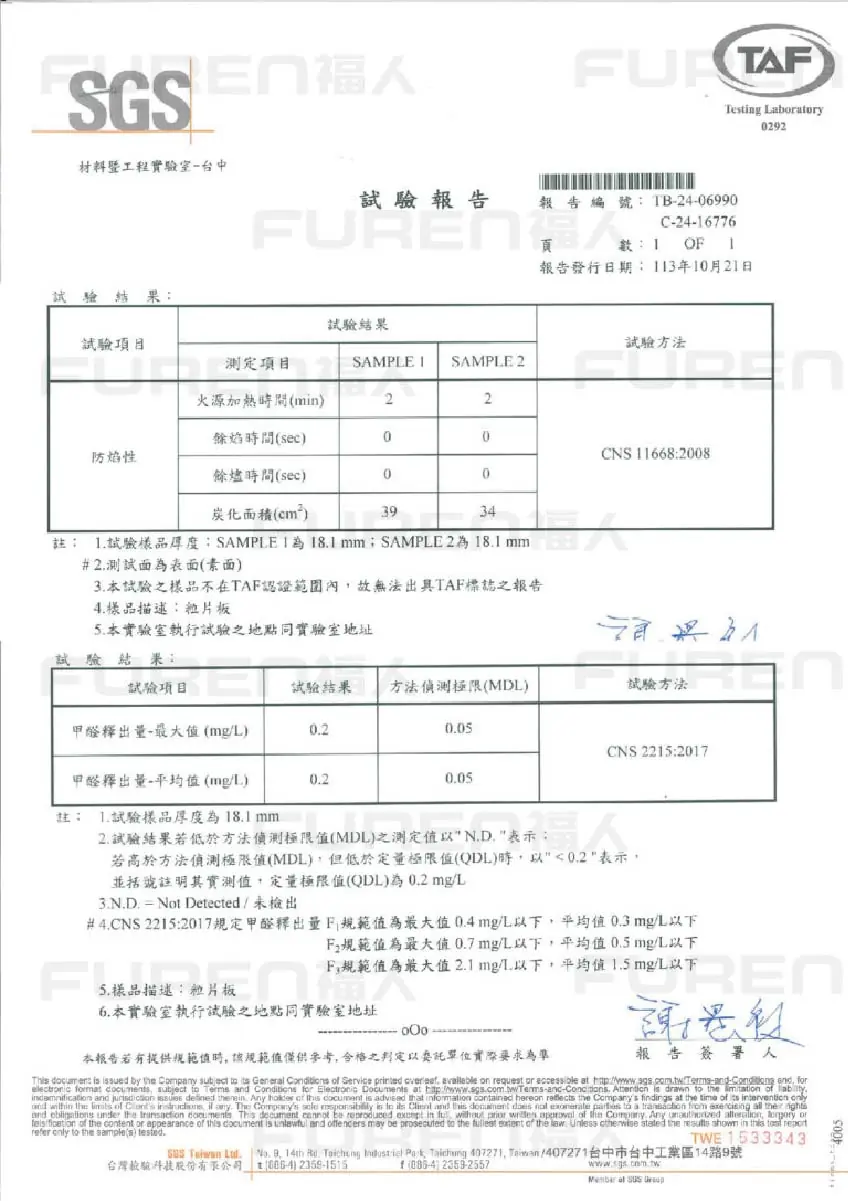 SGS 防焰性、甲醛釋出量合格