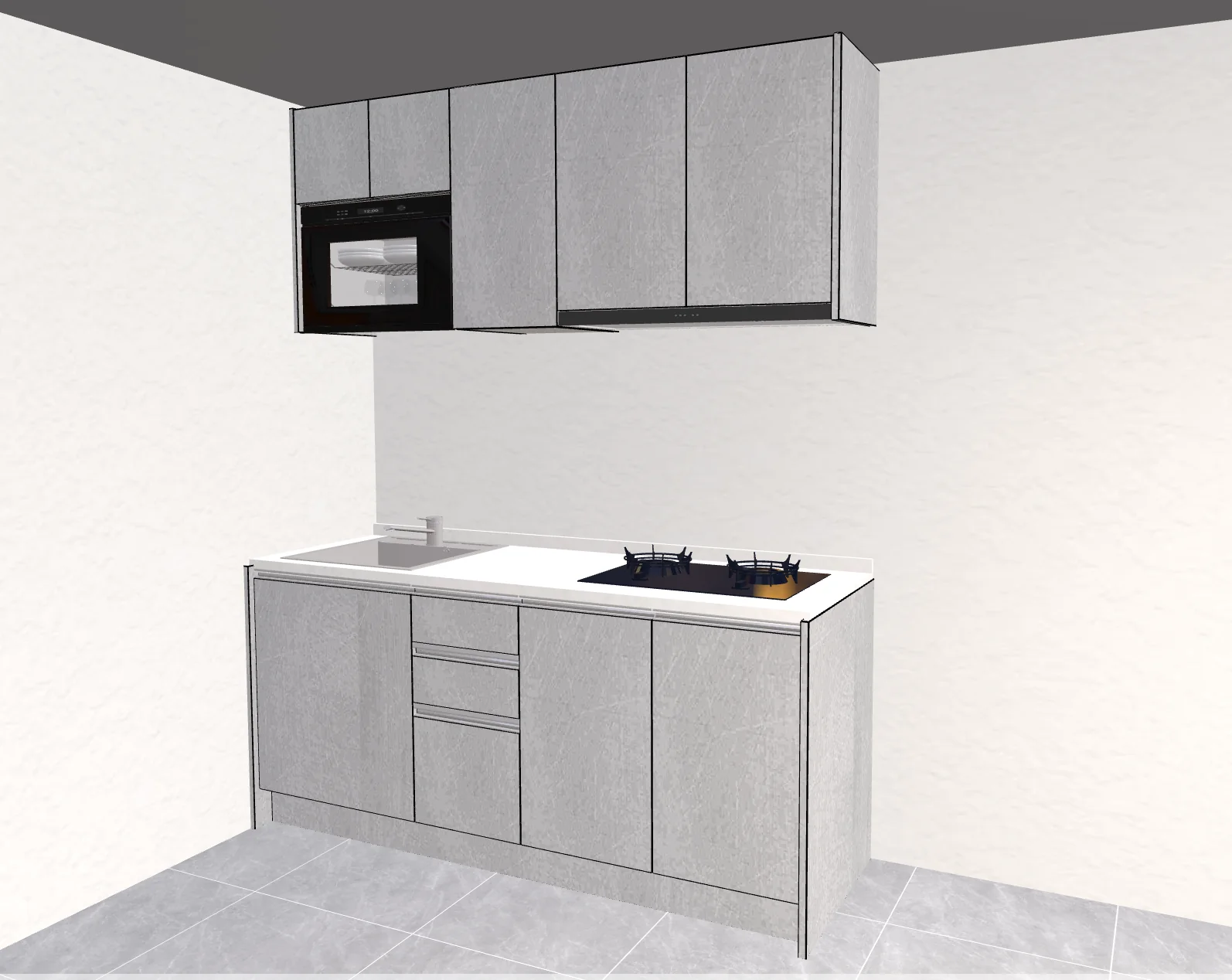 – 矮櫃:門片鋁C把手、韓國人造石、水槽、水龍頭、五連勾、木抽屜、瓦斯爐